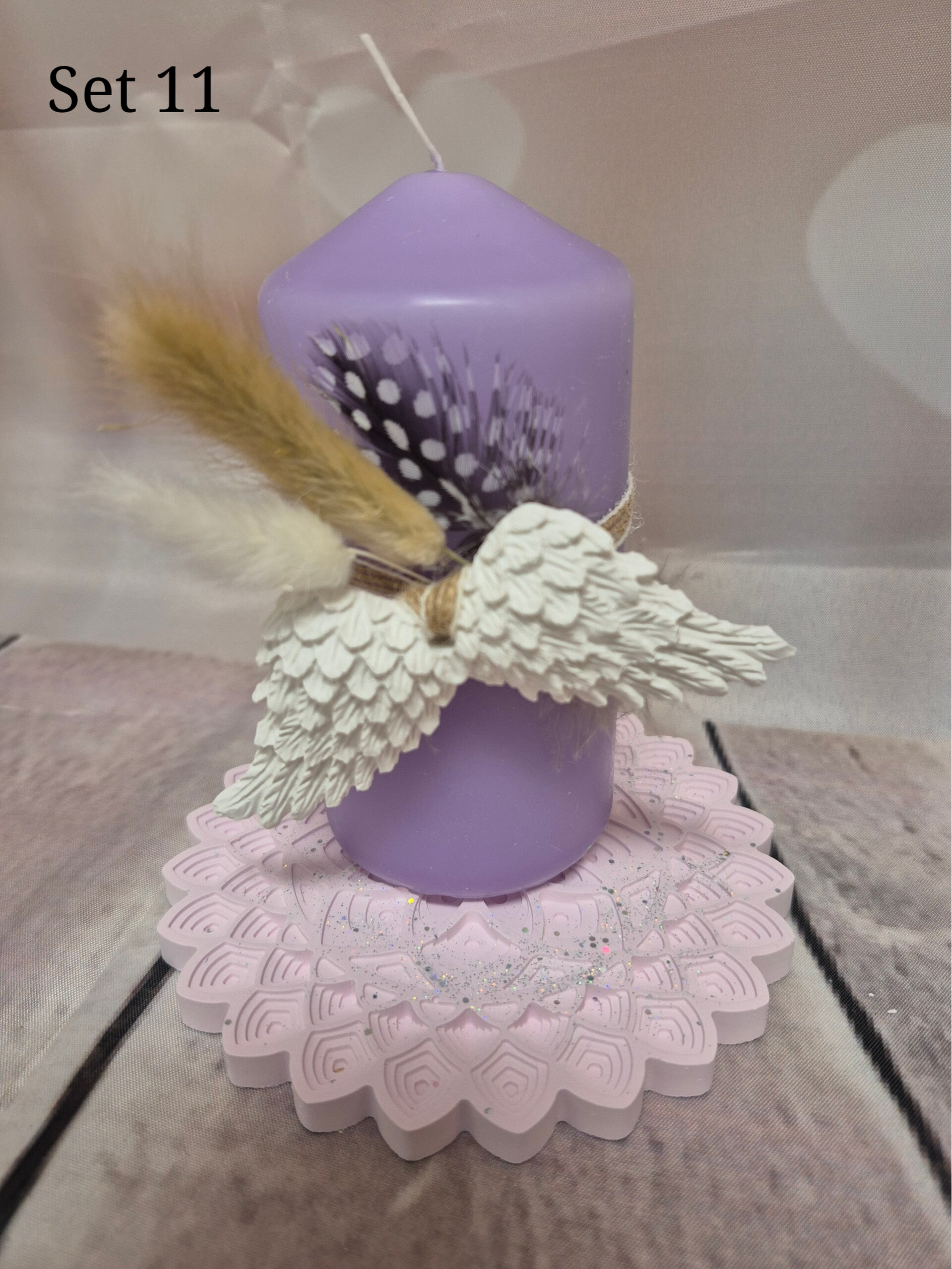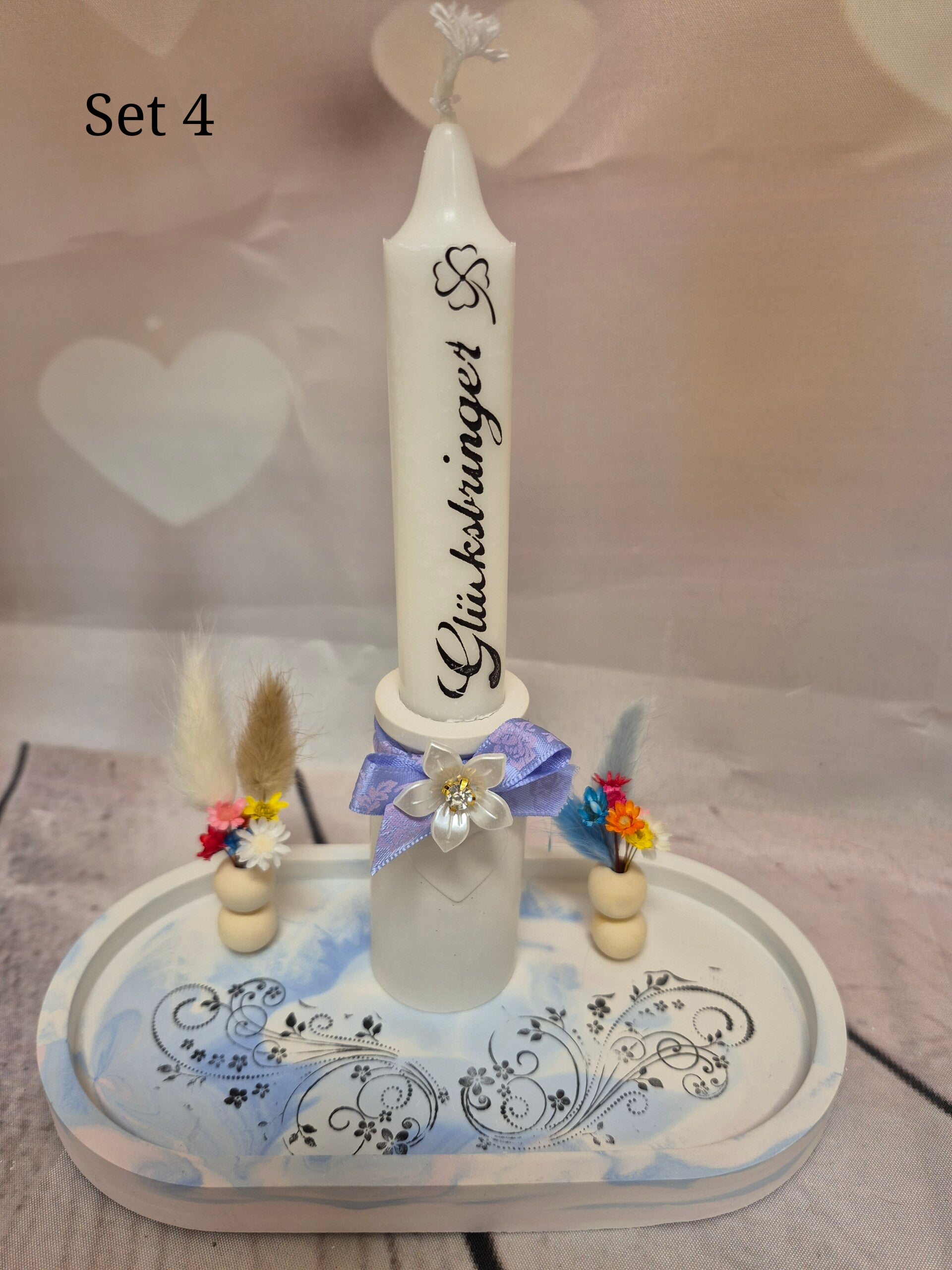 Untersetzer mit Kerze, Trockenblumen und div. Deko aus Rasyin