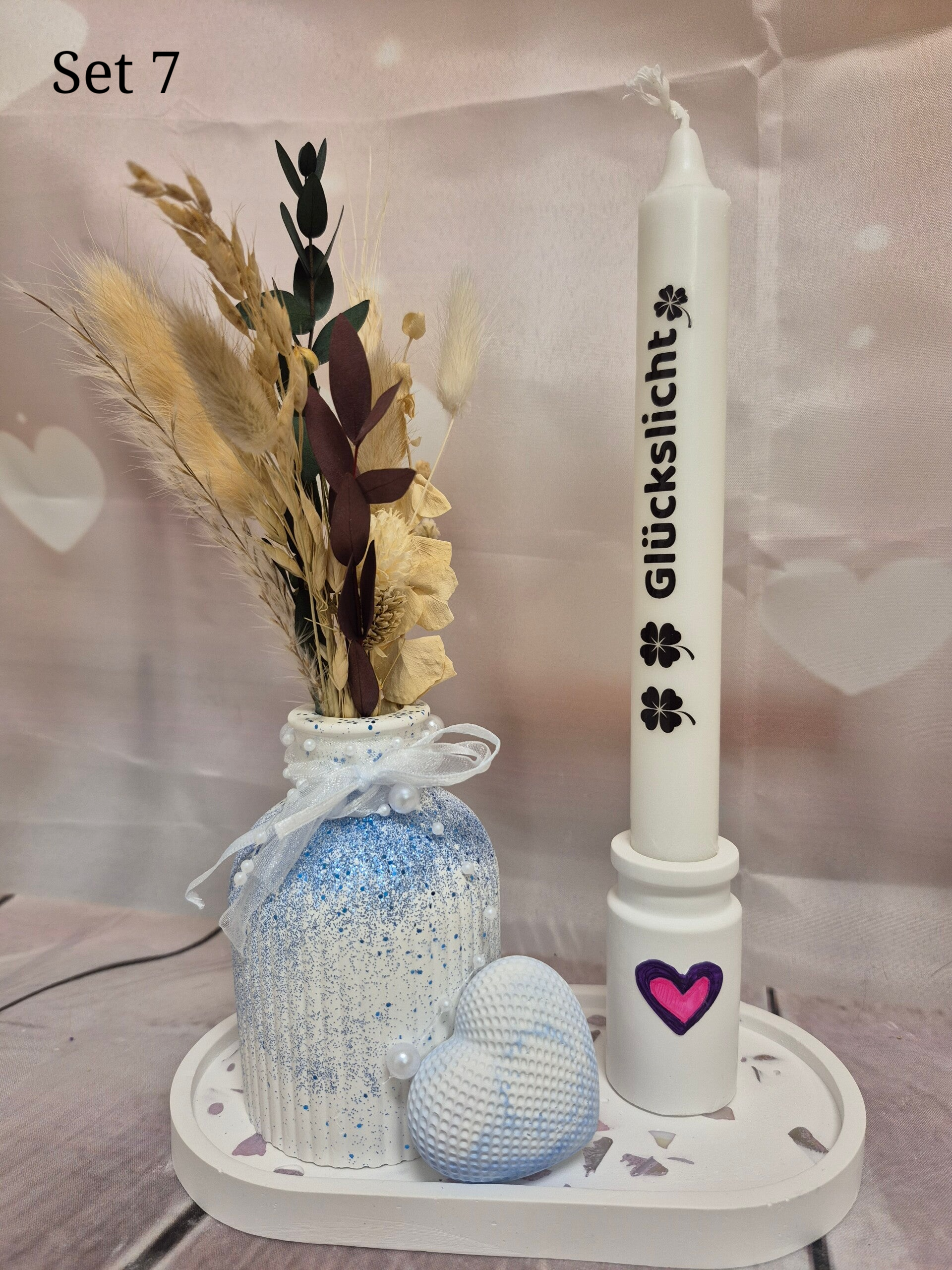 Untersetzer mit Kerze, Trockenblumen und div. Deko.
